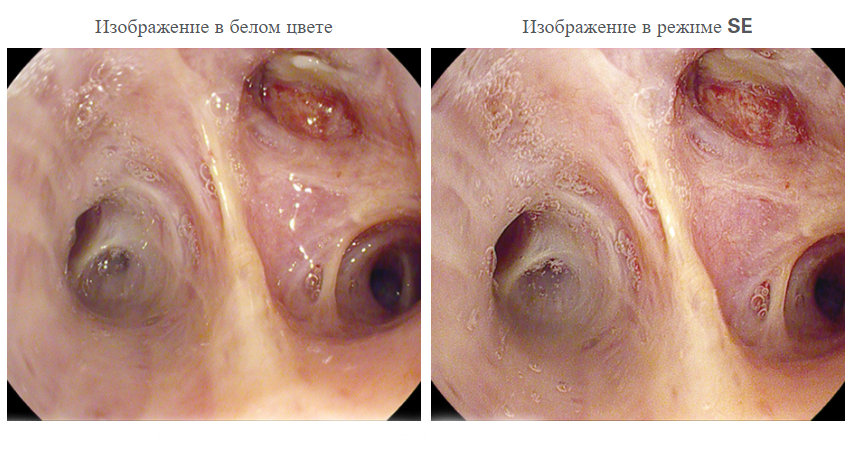 Усиление поверхности (SE) — режим усиливает контраст между светлыми и темными участками за счёт получения данных интенсивности яркости для каждого пикселя и усиливаются краевые компоненты. При обычном усилении мелкие изменения структур воспринимаются как шум, а область с такими изменениями сглаживается. В режиме усиления поверхности более четко визуализируются края, соответствующие мелким изменениям в структуре. С режимом SE гораздо легче визуализировать края анатомического образования, лучше очертить слизистые структуры и складки тканей, приподнимая структуры и подчёркивая кровеносные сосуды.