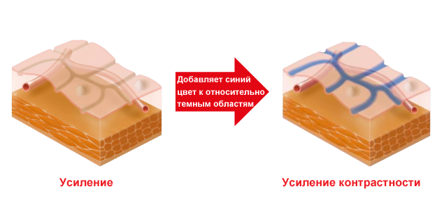 Усиление контрастности (CE) — в режиме CE контрастность усиливается цифровым способом, к областям эндоскопического изображения к темным областям добавляется синий цвет. Используемый алгоритм позволяет исследовать мелкие неровности вокруг поверхности и подробно рассмотреть морфологию сосудистого рисунка слизистой. Усиление контрастности не вызывает изменения в яркости изображения, режим дает небольшое синевато-белое окрашивание углублённых областей, делает резче поверхностные сосуды и усиливает визуализацию текстуры слизистой. Усиление поверхности и контрастности сохраняют естественные цвета, режимы переключаются на низкий, средний и высокий уровни. Режимы используются для выявления новообразований и опухолей ЖКТ на ранних стадиях.