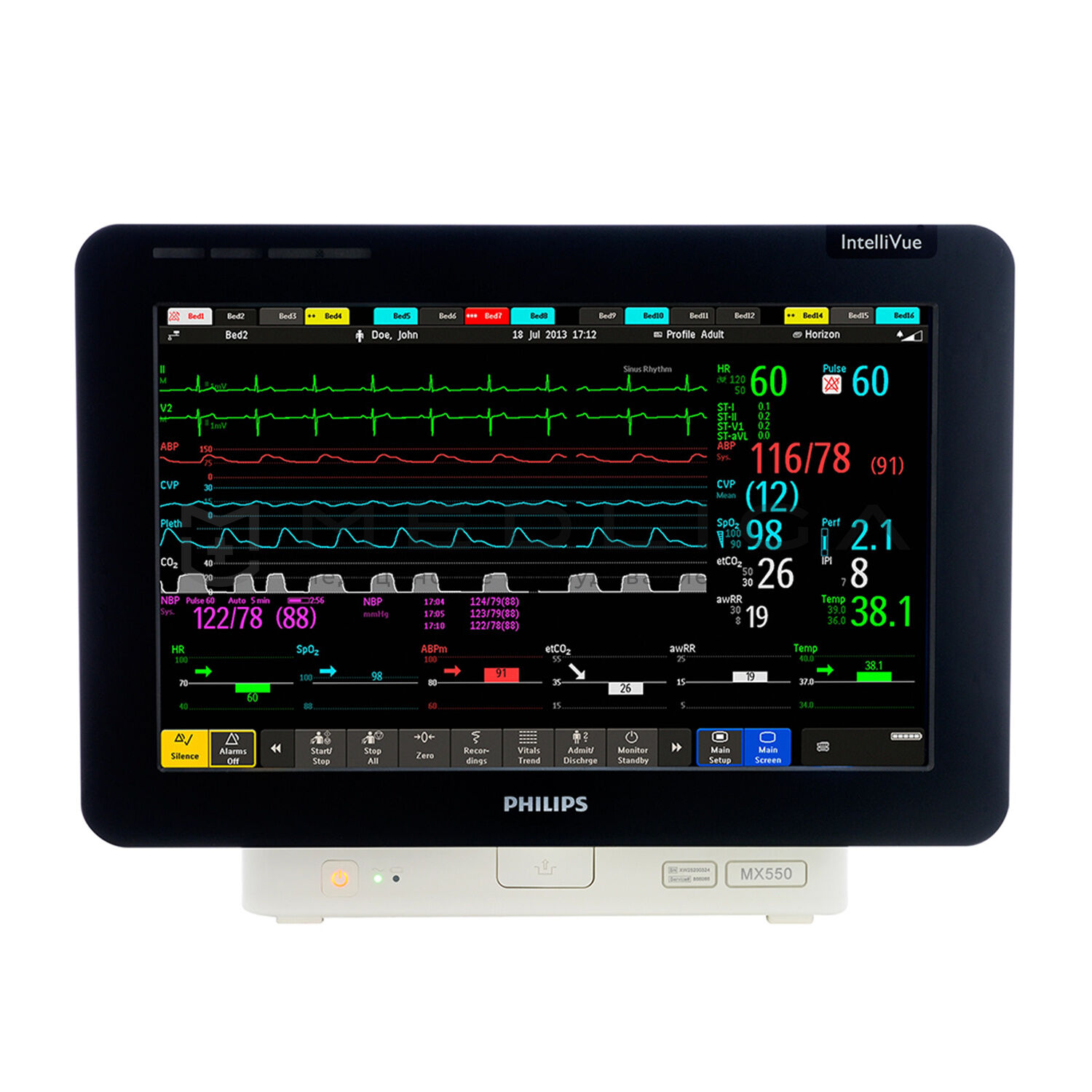 IntelliVue MX550 сочетает в себе высокотехнологичные функции прикроватного мониторинга и возможность резервного питания от батареи. Аппарат оперативно предоставляет необходимую информацию, что позволяет расставить приоритеты при оказании помощи нескольким пациентам одновременно.